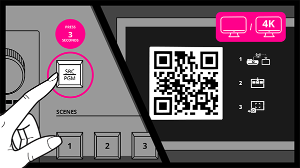 4. Press and hold the SRC/PGM button on the StreamEnjin to display the QR-Code on your SRC/PGM output monitor.