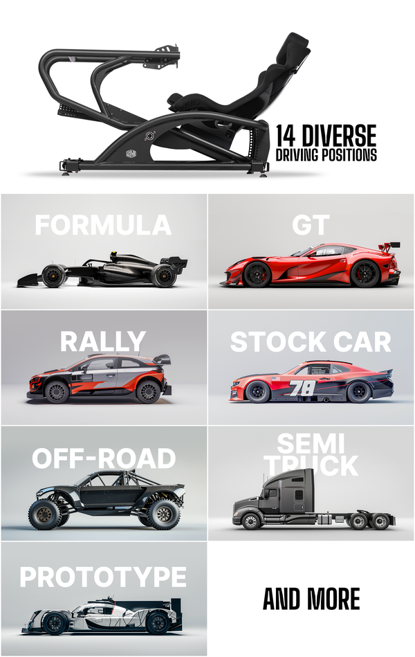 One single adjustment offers 14 diverse driving positions: Formula, GT, Rally, Stock Car, Off-Road, Semi Truck, and more. The Dyn X adapts to your personal simulation needs.
