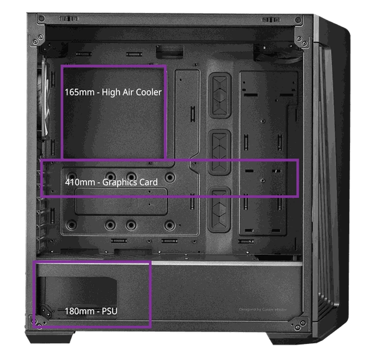Support for up to a 410mm graphics card, a 165mm CPU cooler, and up to a 180mm PSU in length provides room for upgrades to stay ahead of the game.