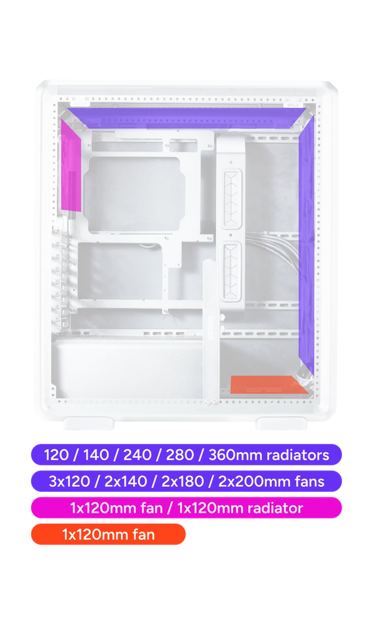 Can house up to eight fans and multiple radiator sizes (up to 360mm), ensuring superior thermal performance.